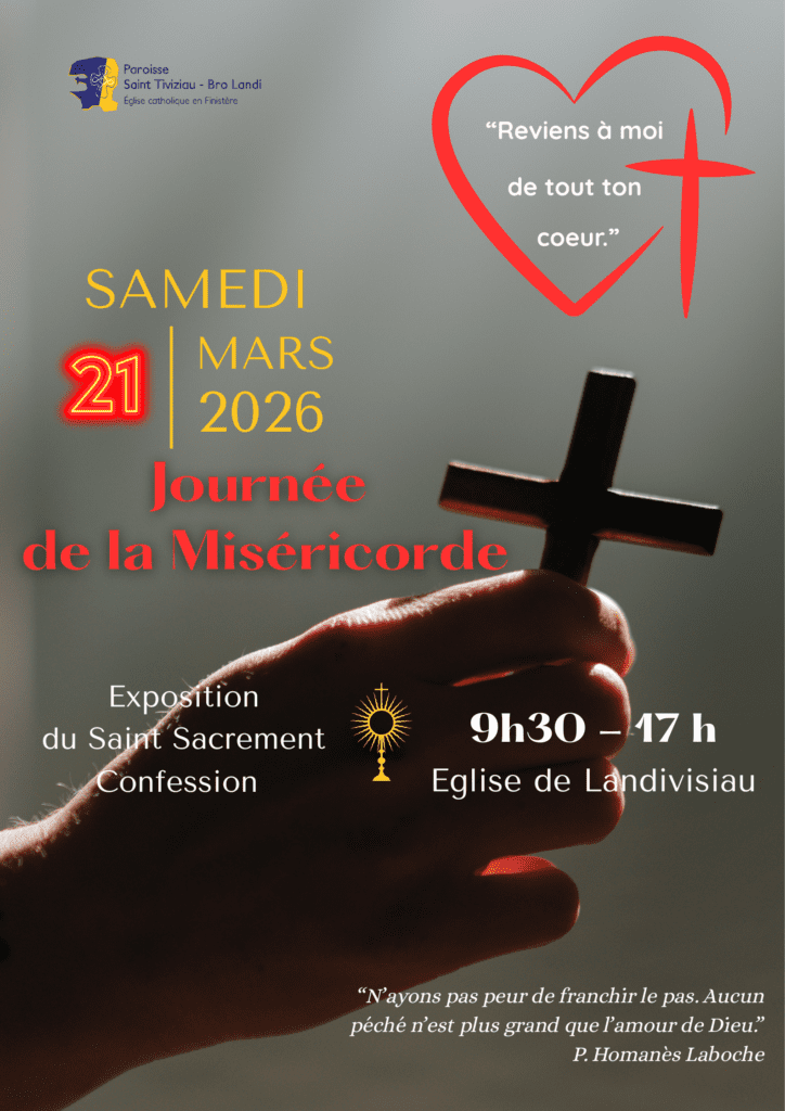 « Ce sera très simple. À 9h30, le Saint-Sacrement sera exposé dans l’église. Six prêtres des paroisses voisines seront présents tout au long de la journée : trois dans la matinée et trois dans l’après-midi. Les paroissiens pourront venir librement, à tout moment de la journée, pour rencontrer un prêtre et recevoir le Sacrement de la réconciliation. Pour nous aider à mieux nous préparer à travers un examen de conscience, la paroisse proposera également une célébration pénitentielle le mardi 17 mars à 16h, à l’église de Landivisiau. Cette Journée de la Miséricorde sera un moment privilégié pour : prendre un temps de prière et de silence, recevoir le Sacrement de la réconciliation, retrouver la paix intérieure. N’ayons pas peur de franchir le pas. Aucun péché n’est plus grand que l’amour de Dieu. Comme le dit saint Paul : « Là où le péché s’est multiplié, la grâce a surabondé. »( Rm 5, 20). Aucun éloignement n’est trop grand pour empêcher son accueil. Que cette journée soit, pour notre communauté, un véritable temps de renouveau spirituel. Venez nombreux recevoir ce don précieux du pardon et expérimenter la joie d’un coeur réconcilié. »